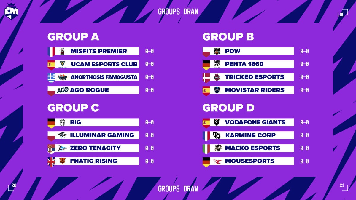 UCAM Esports se encuentra en el Grupo A junto a Misfits Gaming, AGO Rogue y Anorthosis Famagusta. Movistar Riders en el Grupo C con PDW, Penta 1860 y Tricked Esports y finalmente los chicos de Giants en el Grupo D junto a Karmine Corp, Macko Esports y Mousesports.