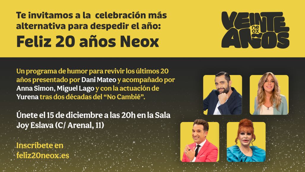 Neox pone el broche final al año con una celebración única: Feliz 20 años Neox, presentado por Dani Mateo y acompañado por Anna Simón y Miguel Lago. El especial repasará dos décadas de televisión con humor, anécdotas y la actuación de Yurena, que volverá a interpretar su mítico 'No cambié'.