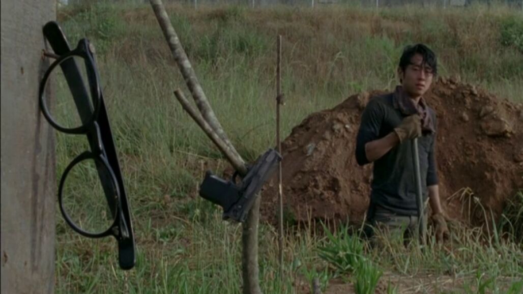 Glenn y Maggie cavan fosas en el patio de la prisión. Entre tanto, examinan a una víctima infectada. El pesimismo por miedo a un contagio masivo es latente en todos.