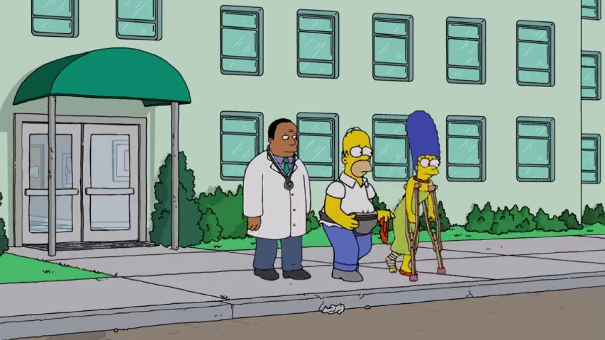 En un arranque de amor, Homer intenta subir en brazos a su esposa pero el cariñoso gesto termina con ambos en el hospital.