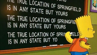 En el último episodio de Los Simpson, emitido el pasado domingo, los responsables de la serie han querido hacer un guiño a las últimas noticias relacionadas con la ubicación real de Springfield. "La verdadera localización de Springfield está en cualquier estado, excepto el tuyo", escribía Bart en la pizarra de su colegio durante la tradicional cabecera de la serie.